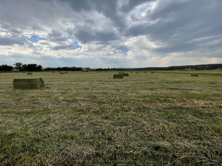 A diversion dam in the Mora River feeds an extensive acequia—the historic three-mile Tipton ditch, to irrigate over three hundred acres. Approximately 80 acres are planted in a grass/alfalfa mix consisting of mainly brome and orchard grasses. The remaining irrigated acreage has a well-established grass stand that produces good-quality grass hay.